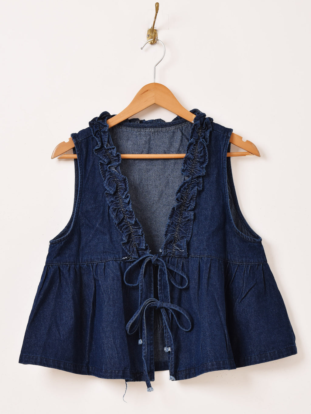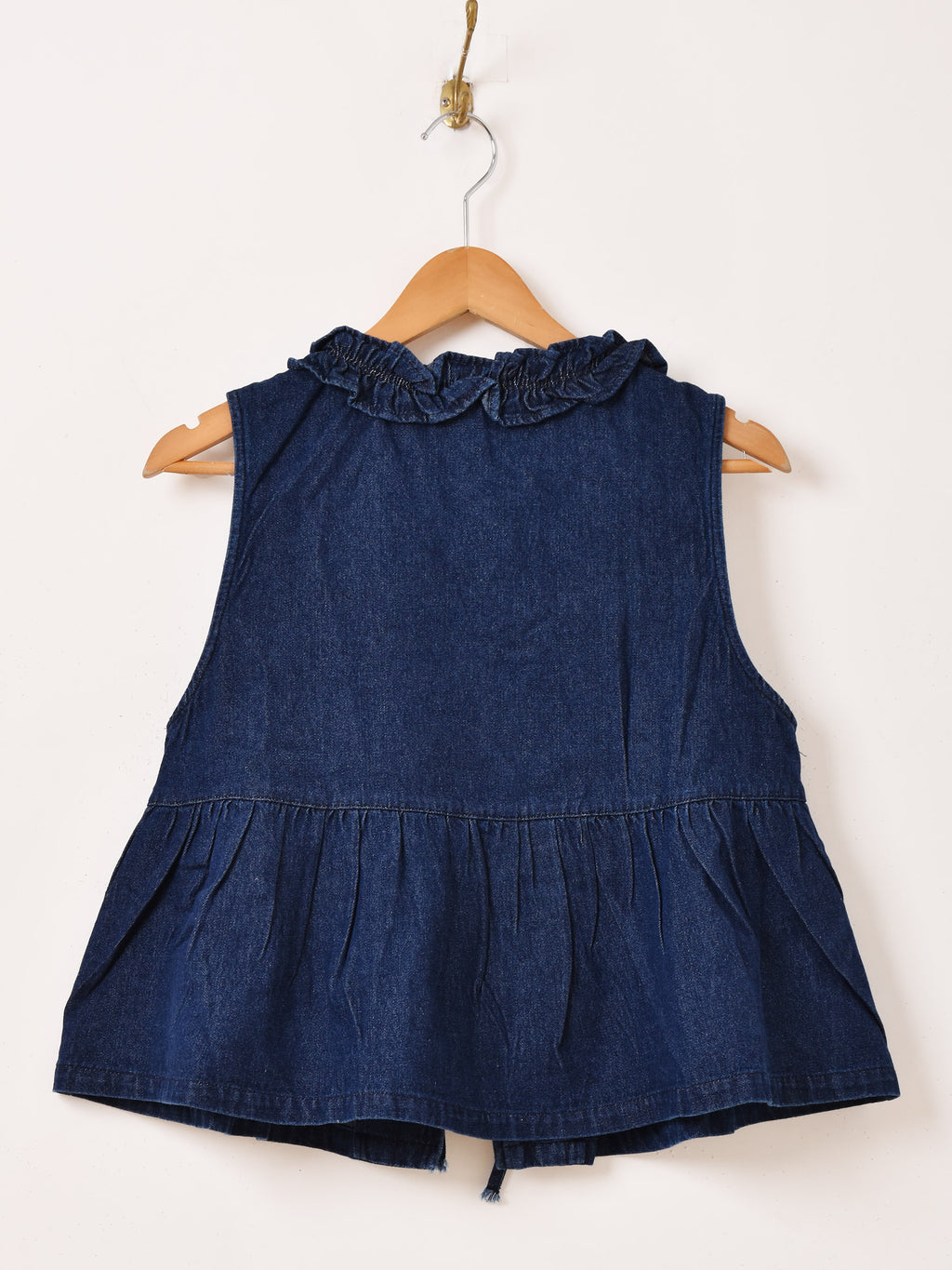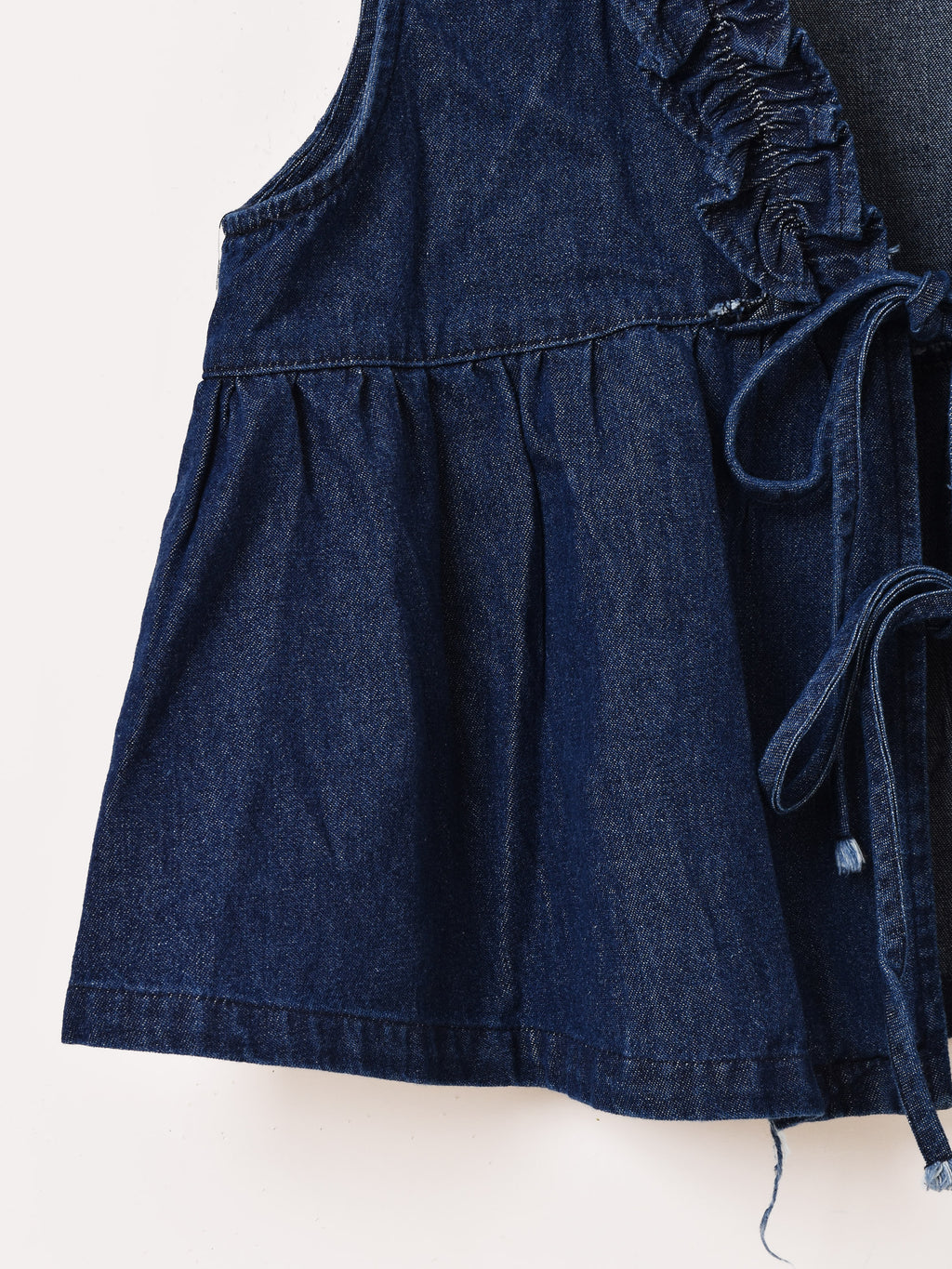フロントにフリルをあしらったデニムベスト。ふんわりペプラムシルエットで体型カバーしつつ、コーディネートのプラスワンアイテムとしてレイヤードアレンジが楽しめます。