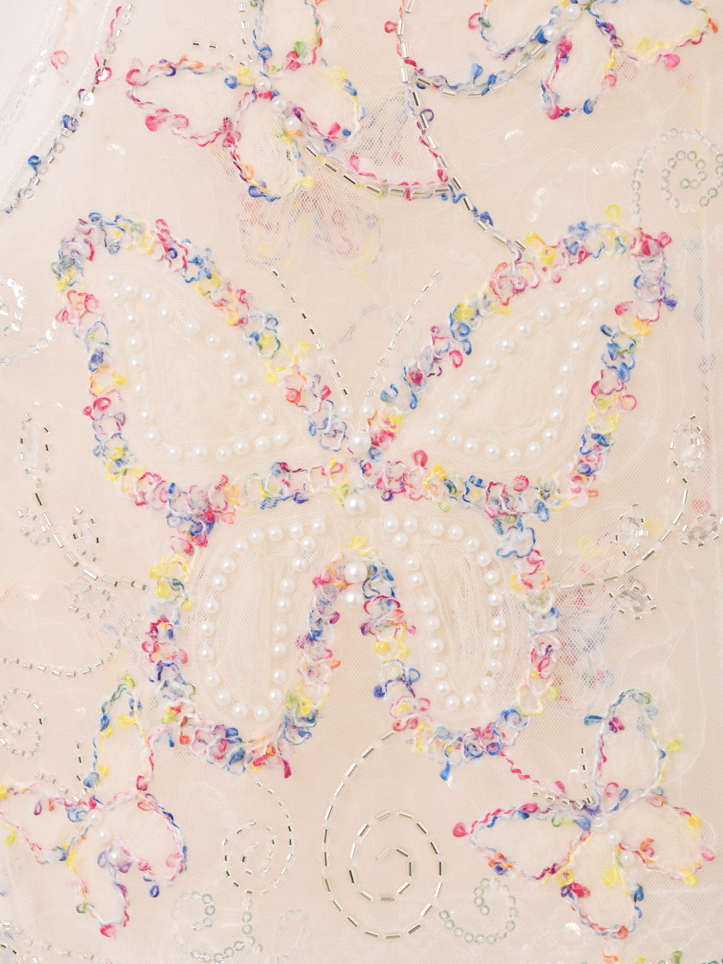 チュール生地に、蝶々モチーフでビーズやカラフルな糸が刺繍されたベスト。キラキラとした華やかな見た目がコーディネートの主役に。インナーなどの上から重ねてレイヤードするのがおすすめです。