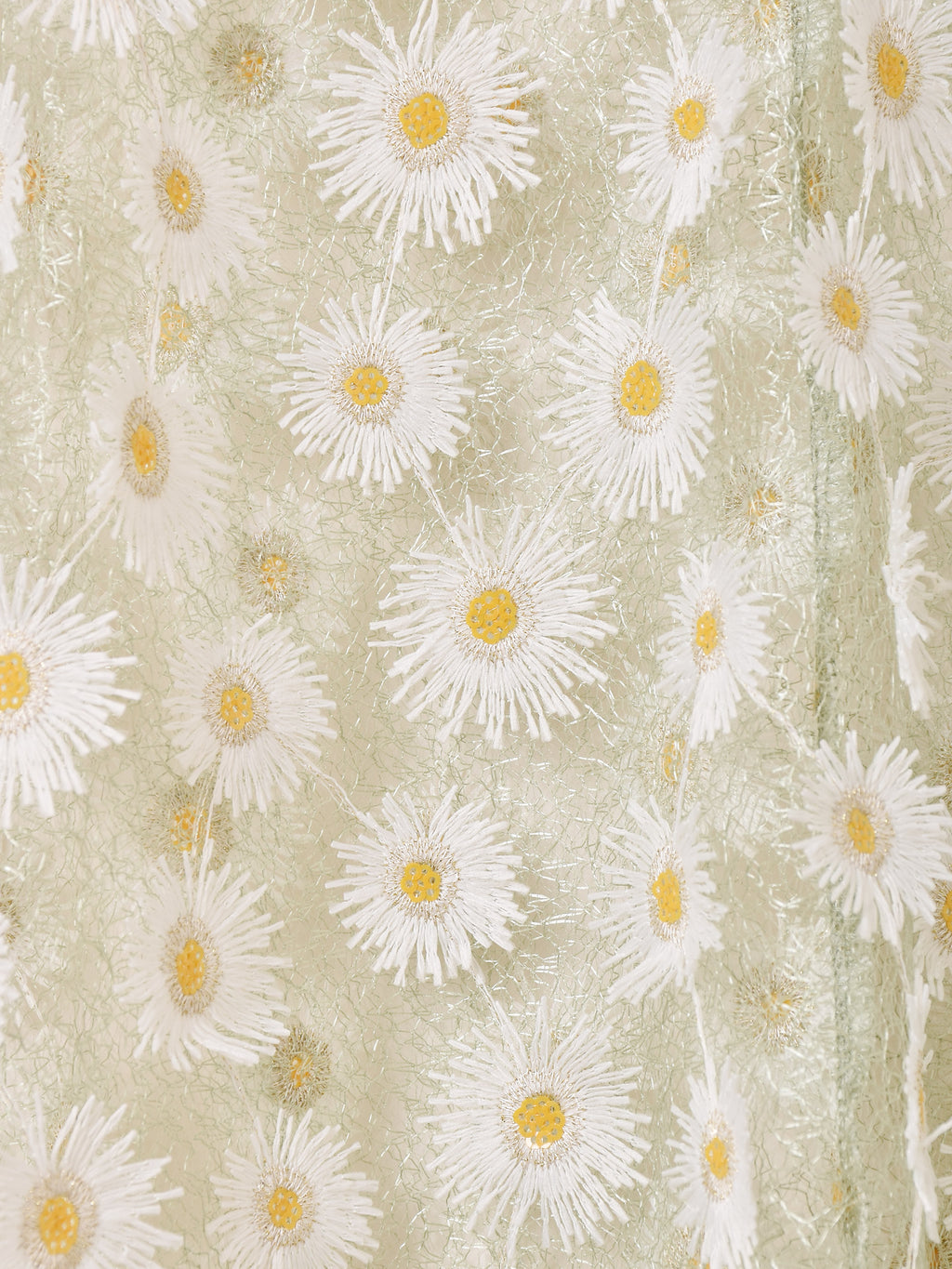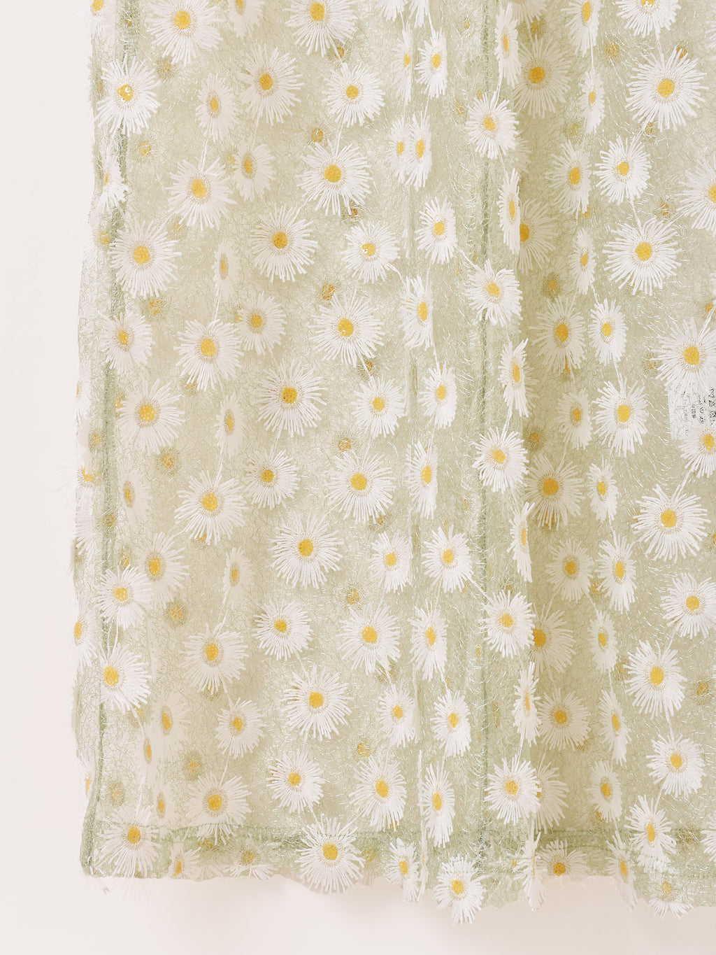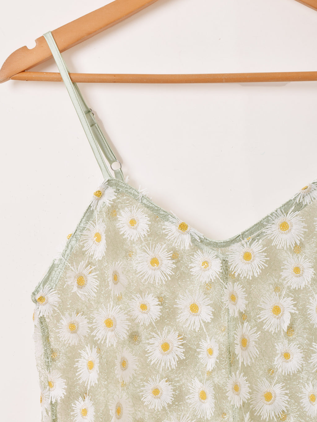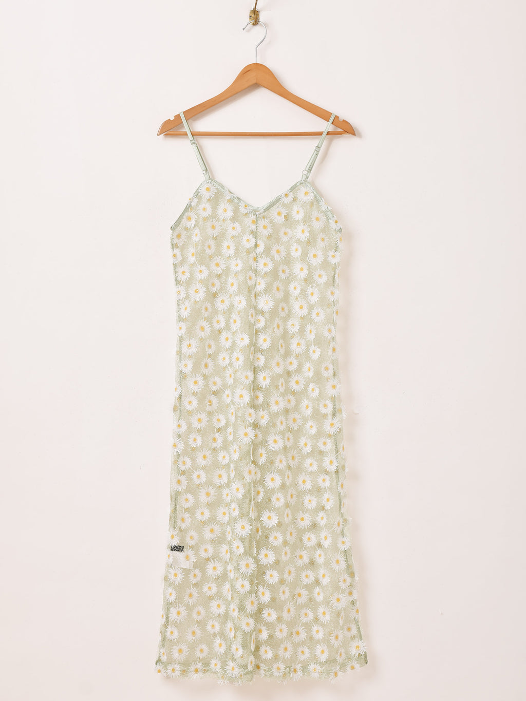 レース生地にたっぷりのマーガレットのモチーフをあしらったキャミワンピ。大胆なレースの透け感にお花デザインで、レイヤードコーデに重宝しつつ、主役として華やかさを与えてくれます。春らしいパステルカラーも可愛い一着です。