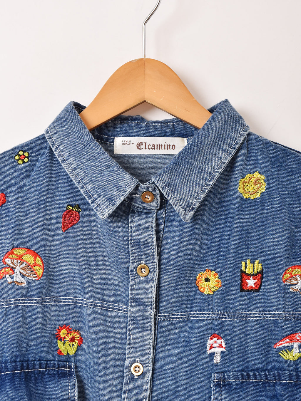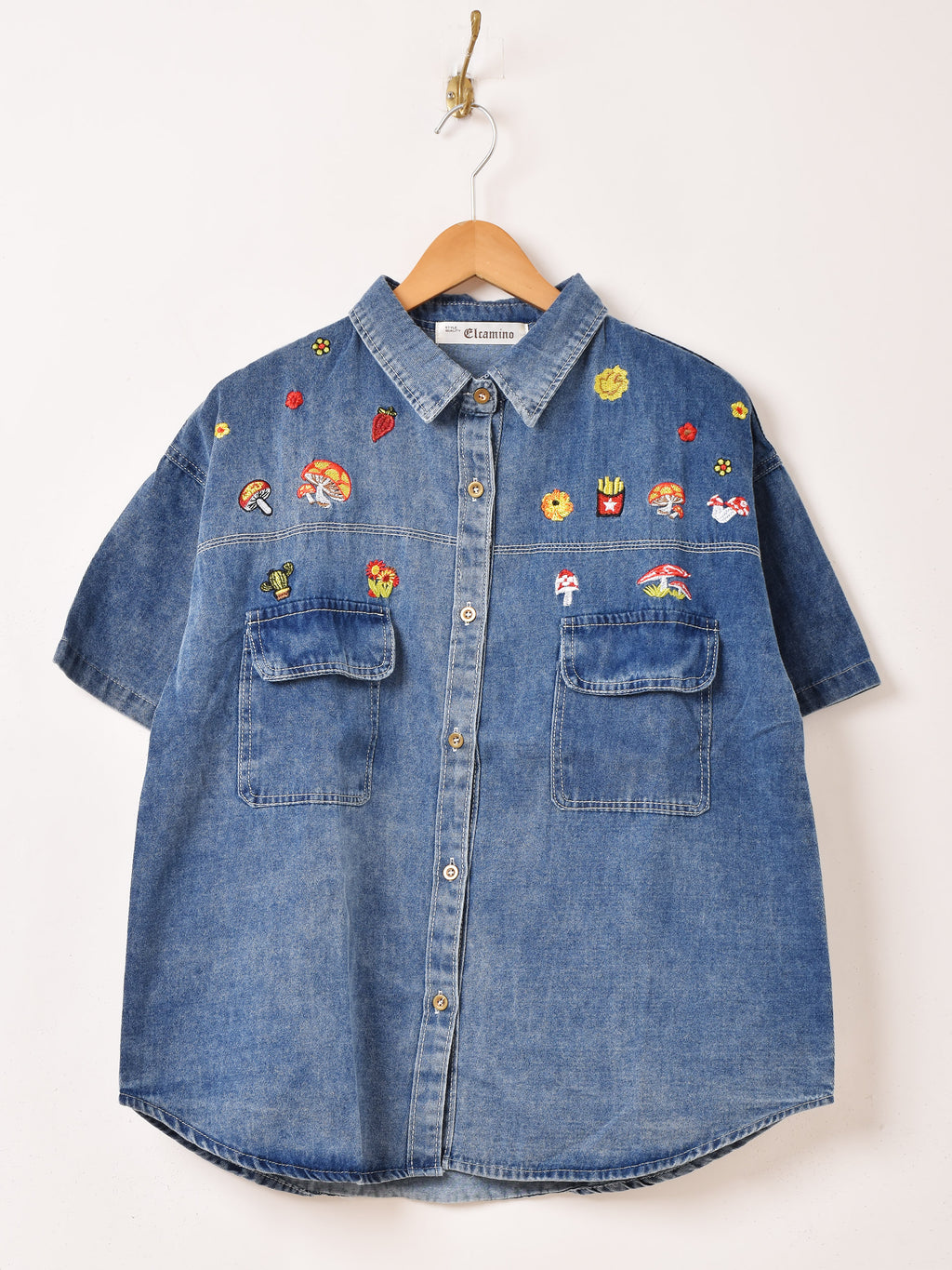 Elcamino キノコ刺繍 半袖 デニムシャツ