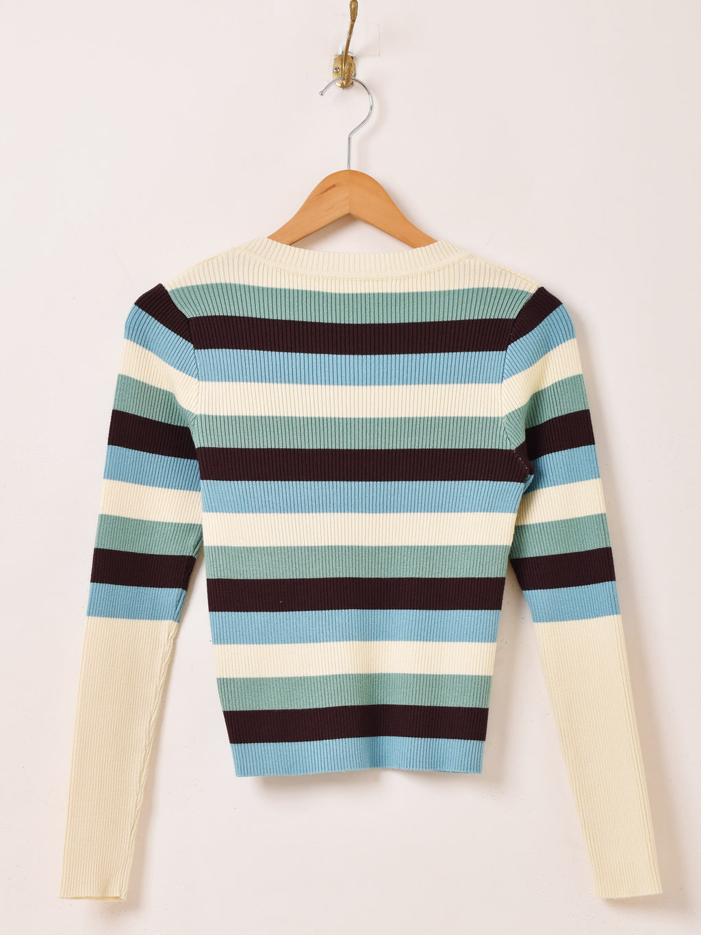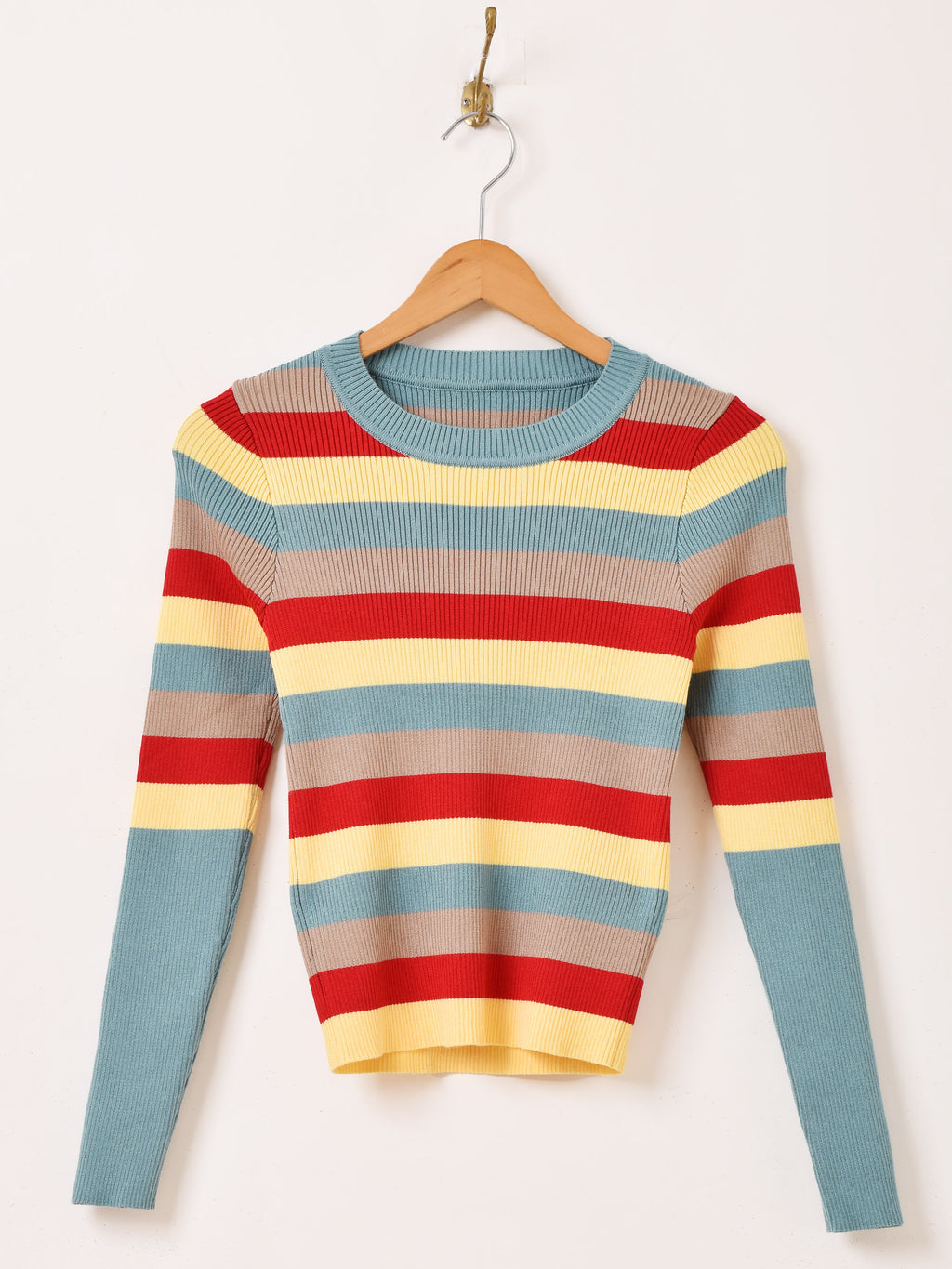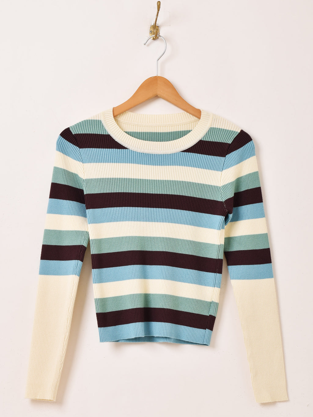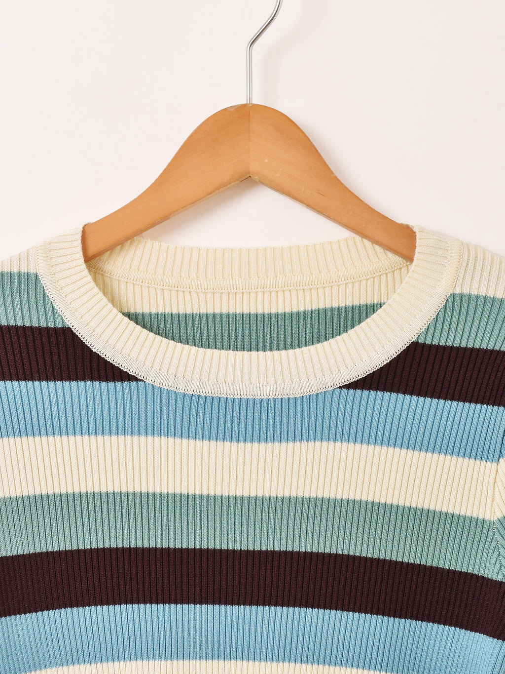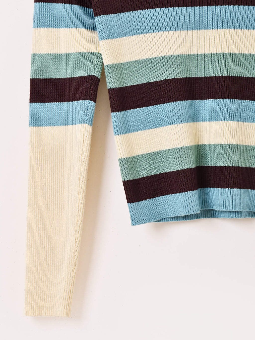 インナー使いにもぴったりなマルチボーダー柄が魅力的なリブニットセーター。程よいフィット感と伸縮性があり、さらっとしたレーヨンニットで仕立てています。