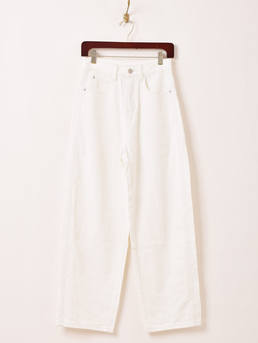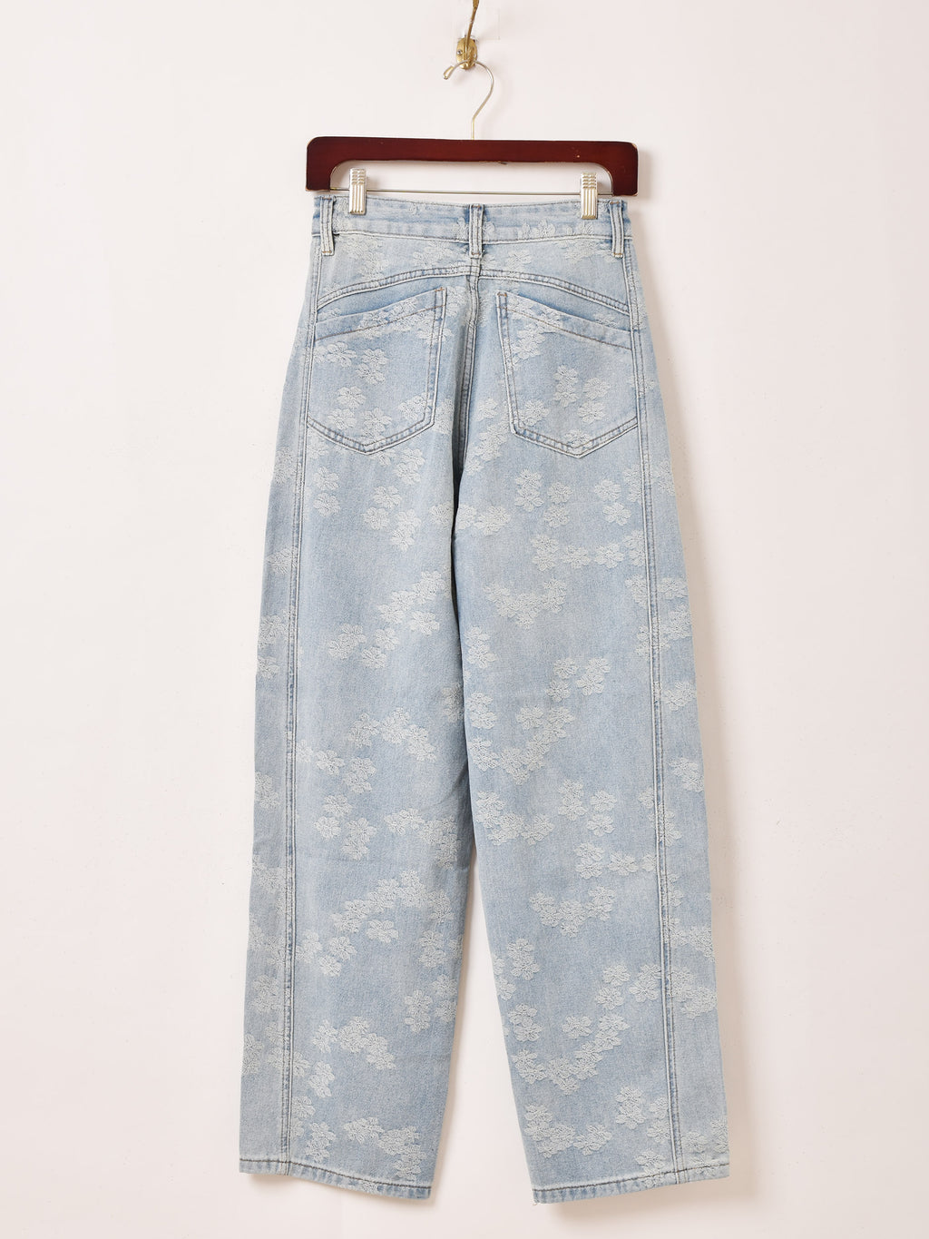 お花のジャガード織り生地のデニムパンツ。程よいテーパードシルエットにハイライズで、こなれた雰囲気を演出しながらもスタイルアップ効果も◎。タイトなトップスとの相性もぴったりの一着です。