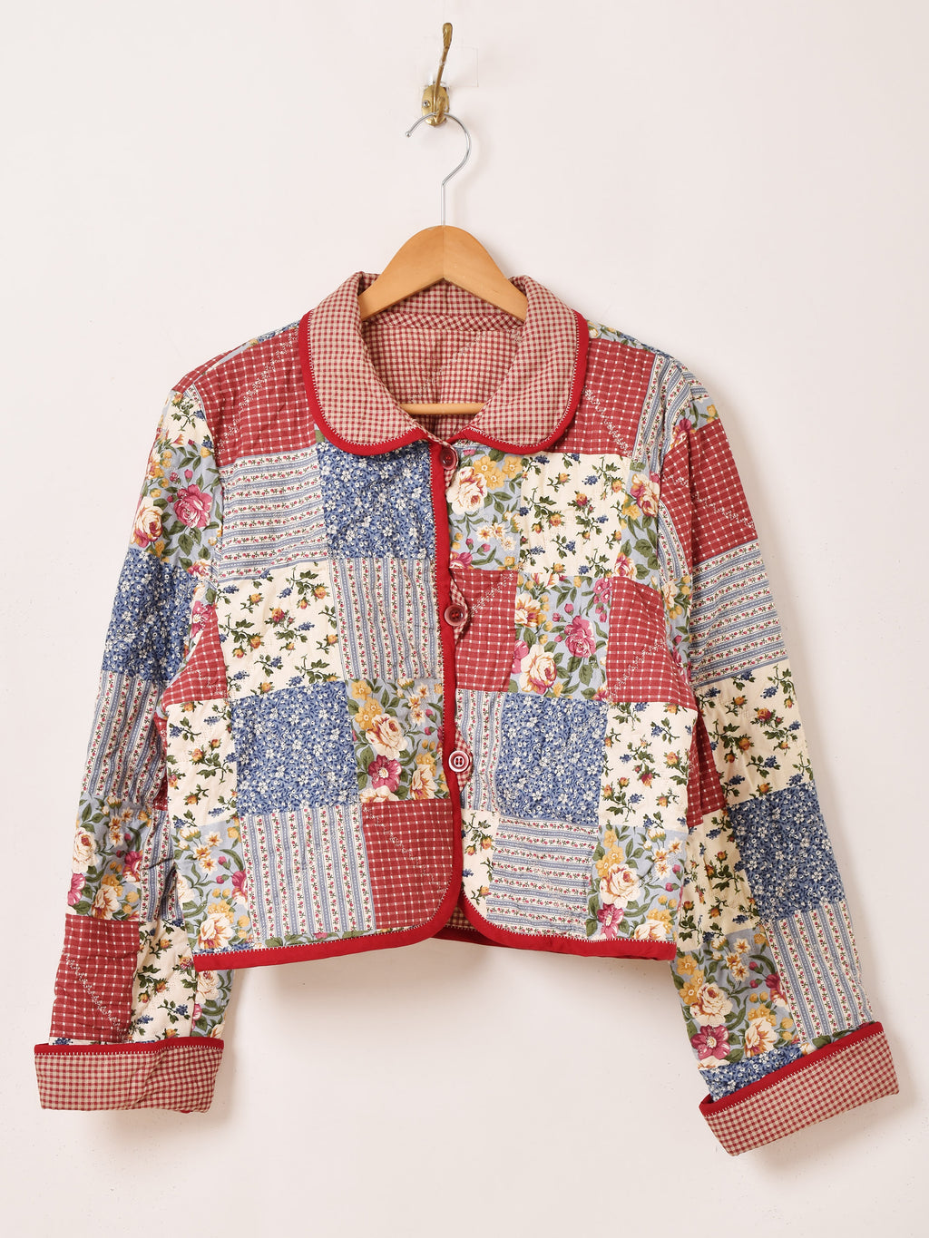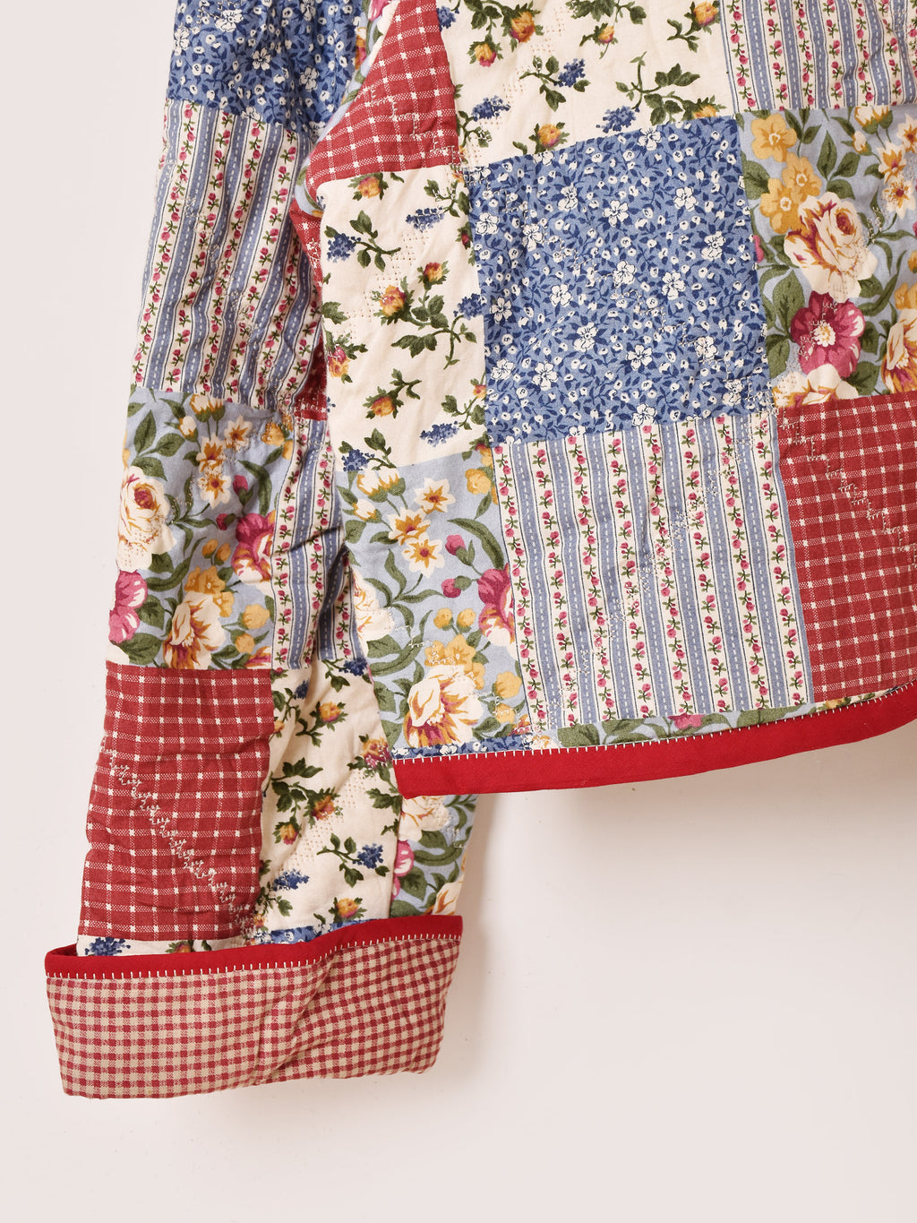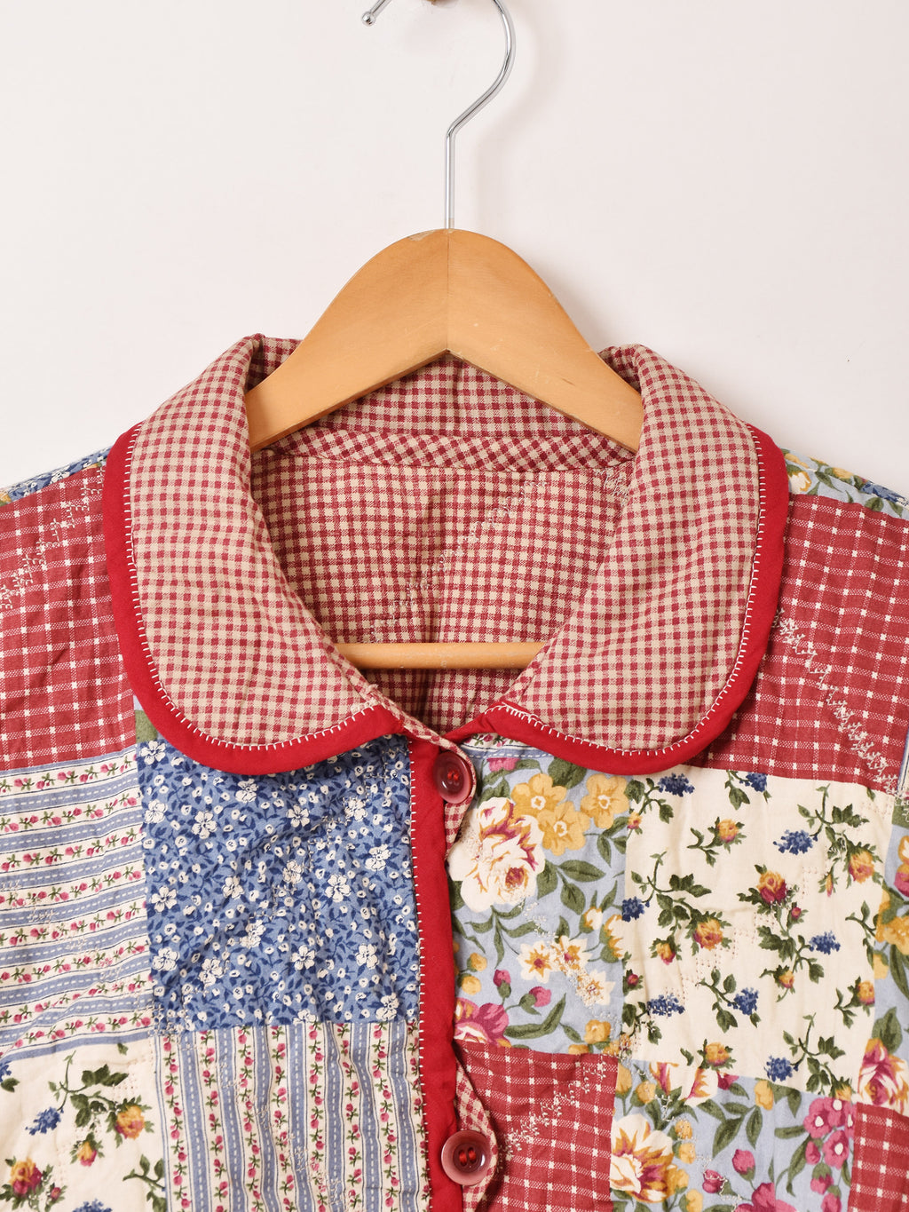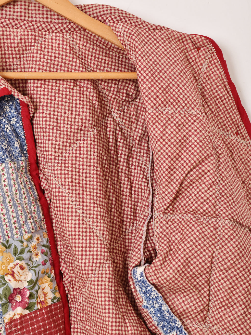 お花のパッチワーク風パターンがレトロで可愛いキルティングのジャケット。裏地は赤のキンガムチェック柄になっています。ショート丈でバランス良くスタイリングしやすい一着です。