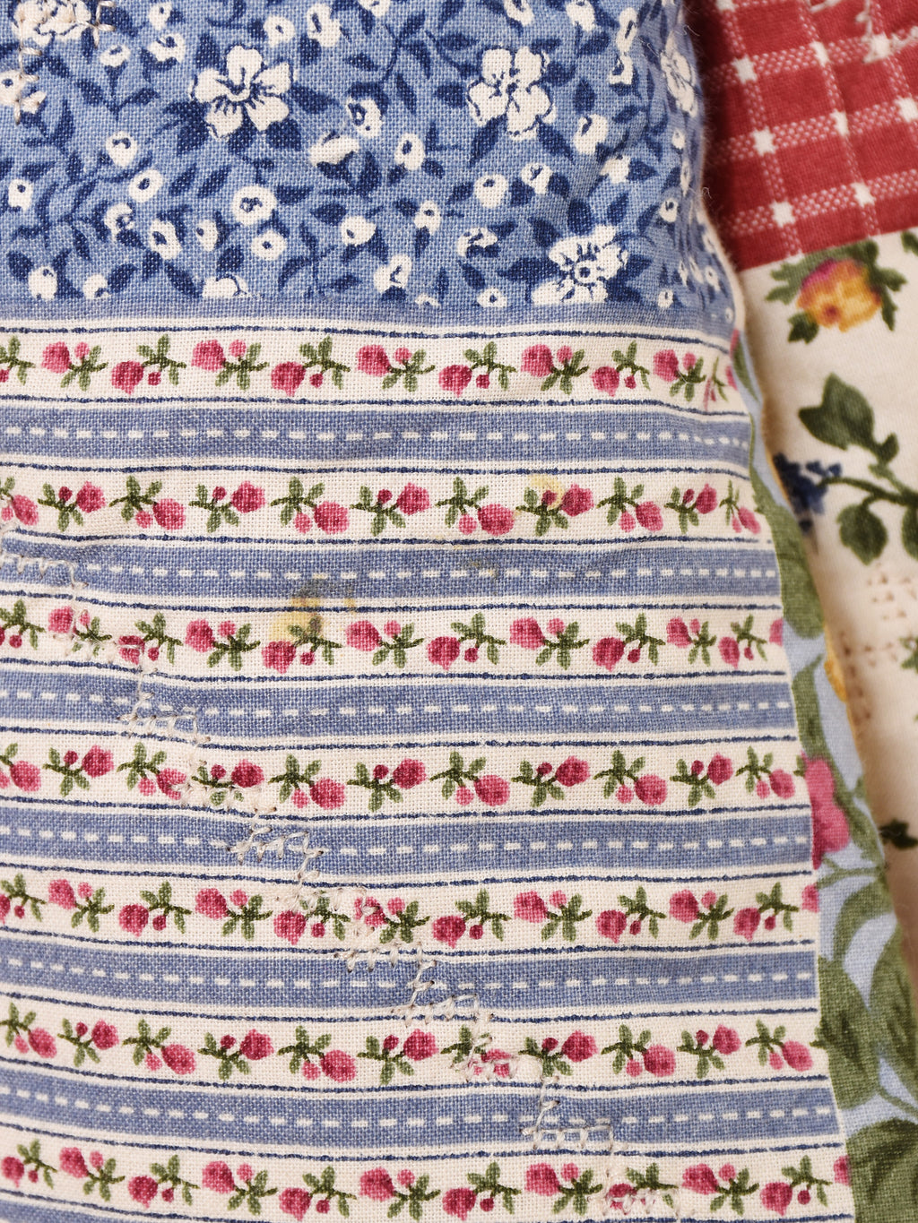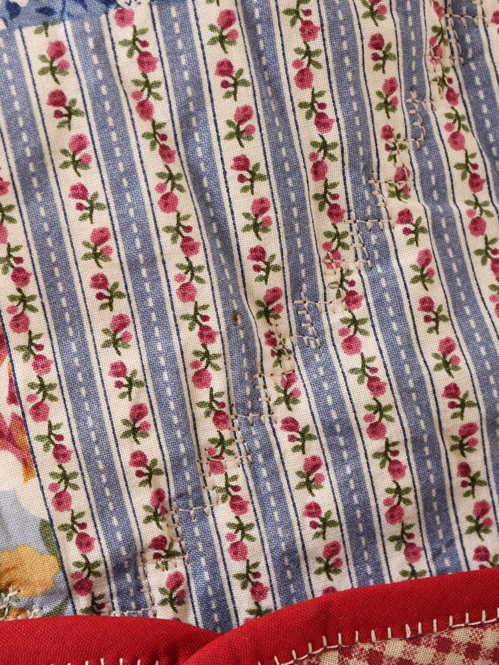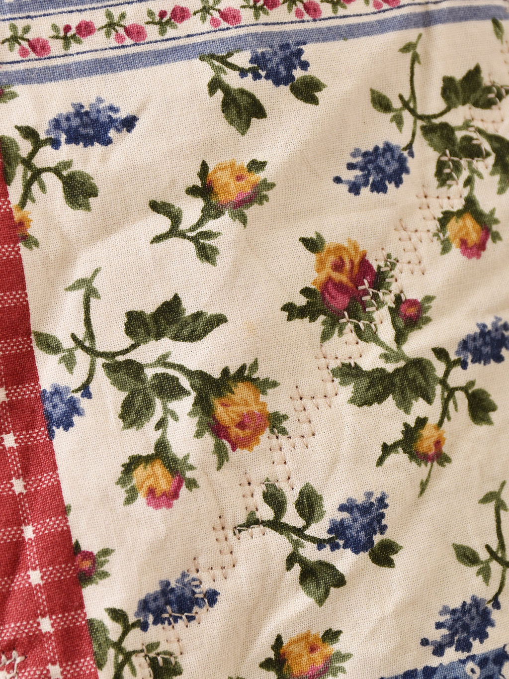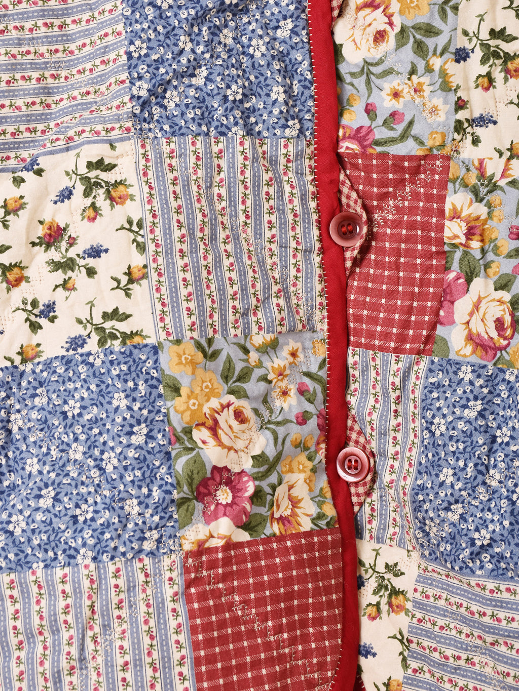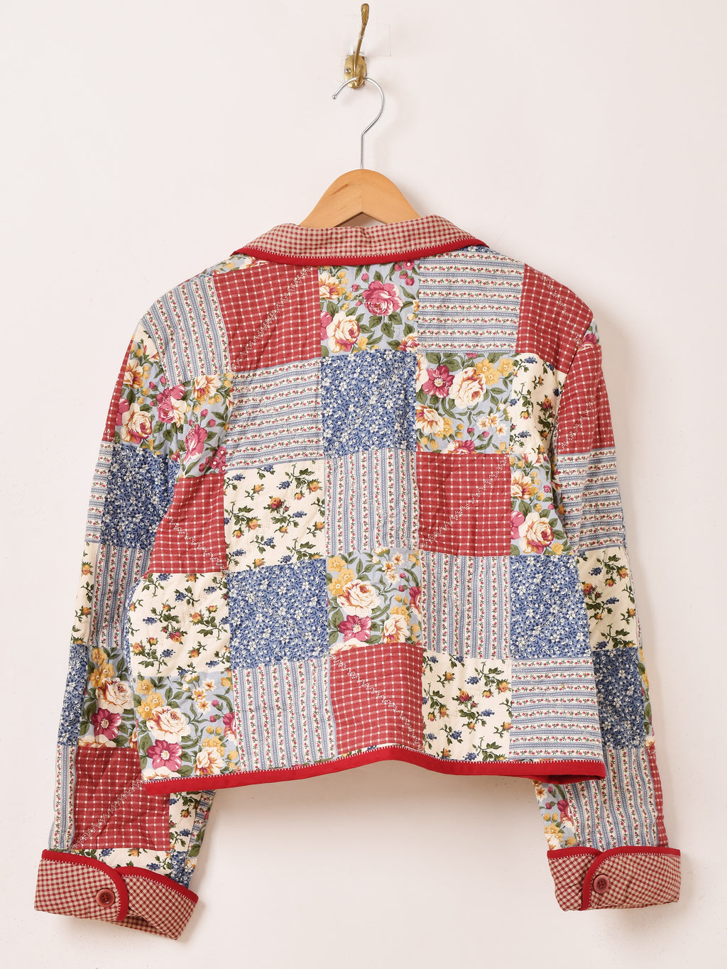 お花のパッチワーク風パターンがレトロで可愛いキルティングのジャケット。裏地は赤のキンガムチェック柄になっています。ショート丈でバランス良くスタイリングしやすい一着です。