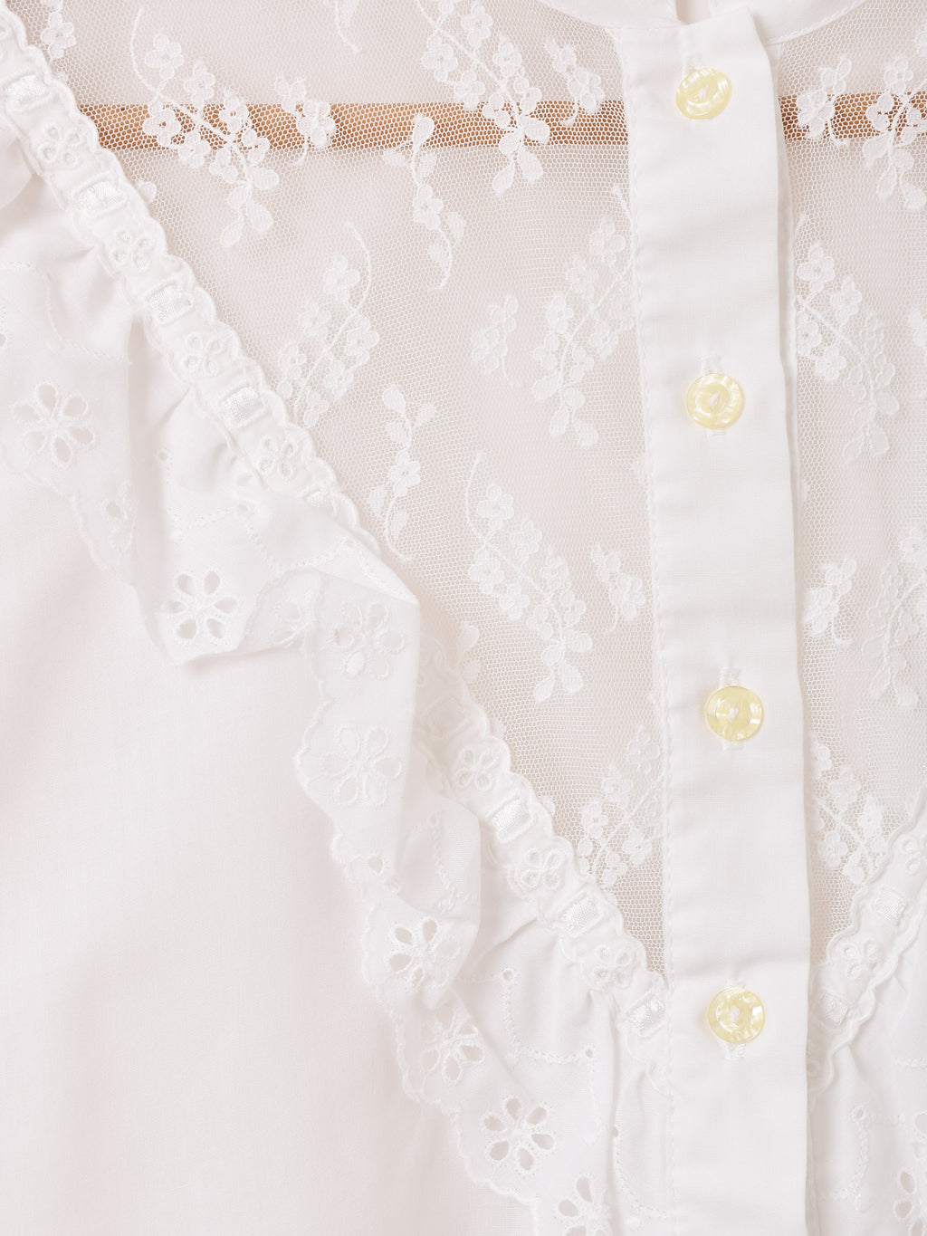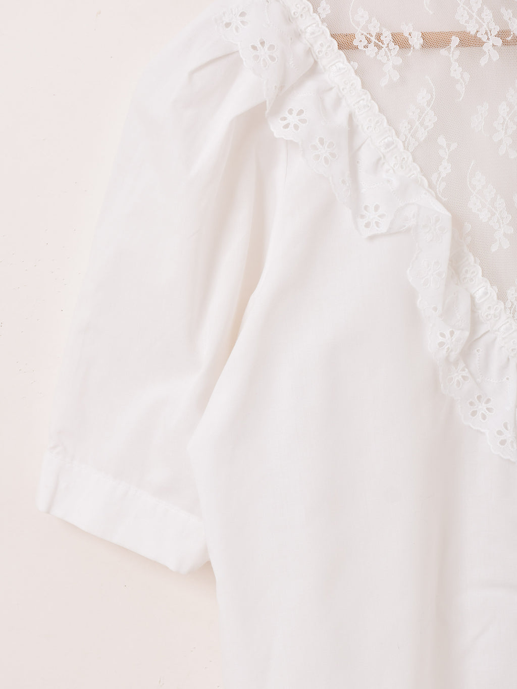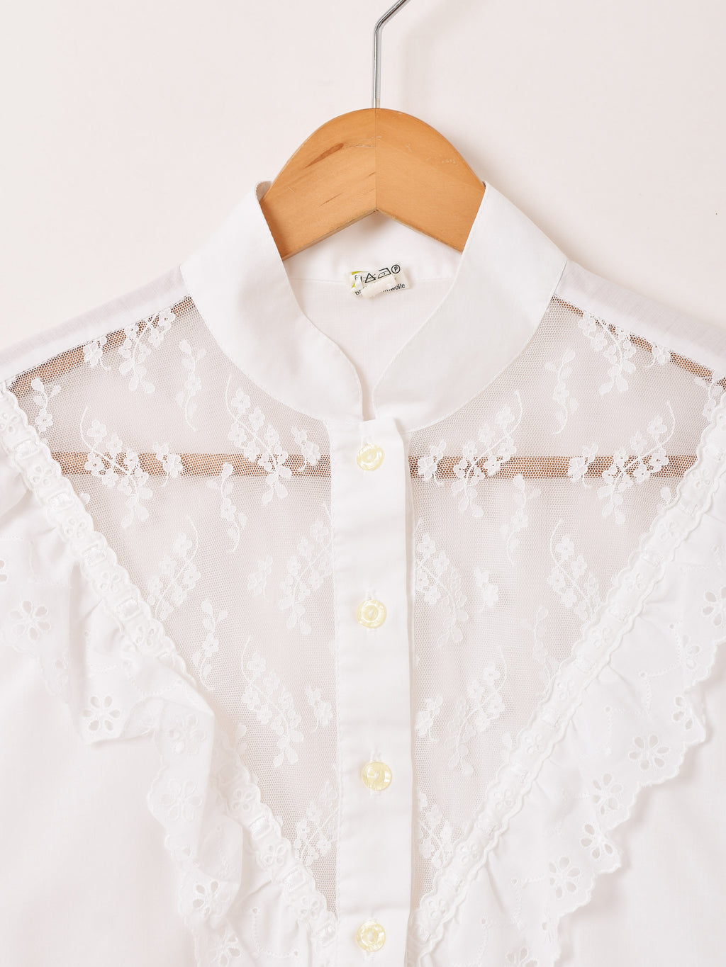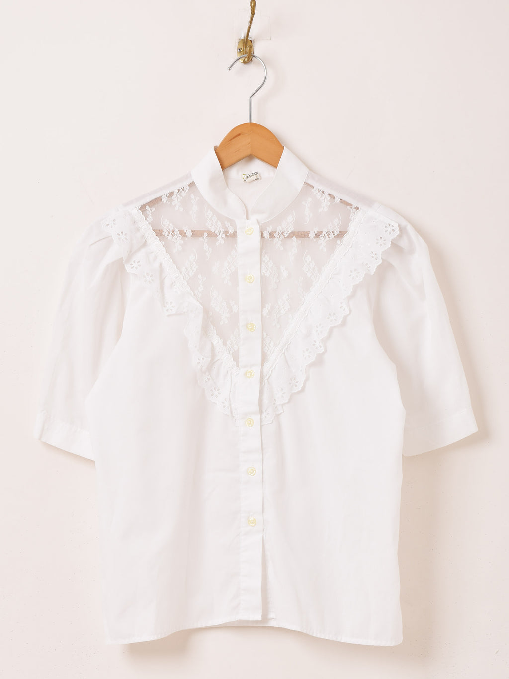 フロントのレース仕様で、程よい透け感が上品な雰囲気たっぷりの半袖ブラウス。チャイナカラーにレースもあしらい、ガーリーな要素が詰まっています。一枚着るだけで華やかなスタイルに仕上げてくれる一着です。