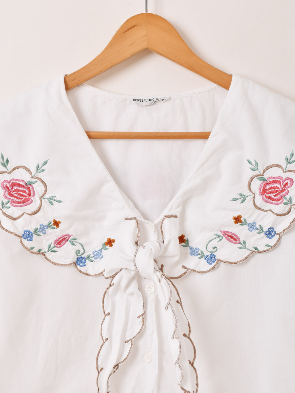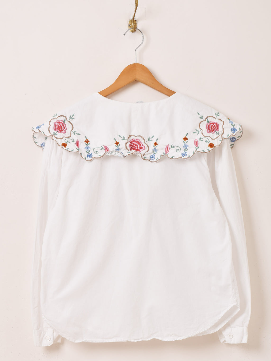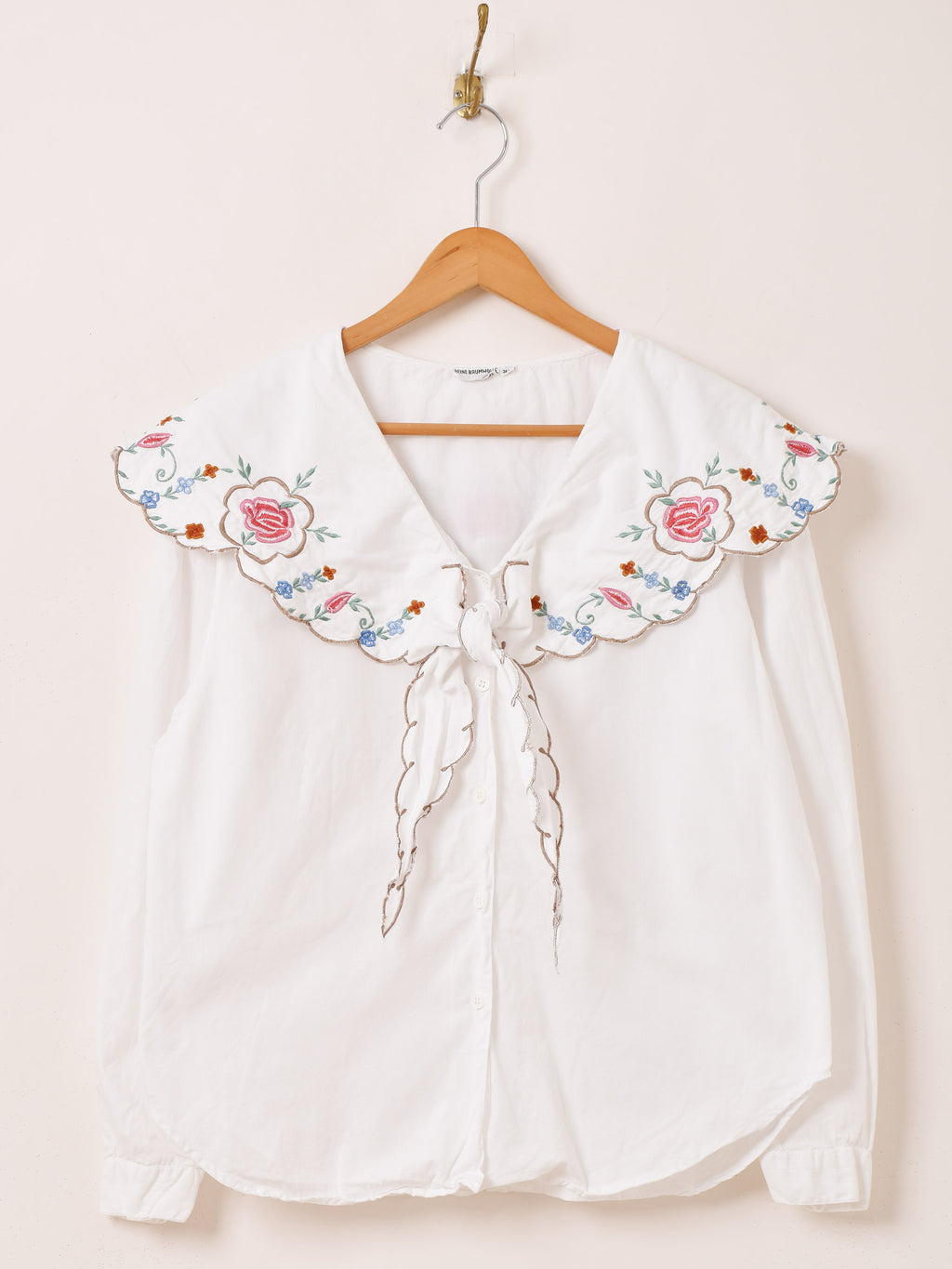 ボウタイデザインの大きな襟に花の刺繍をあしらった、ガーリーな雰囲気たっぷりの長袖ブラウス。一枚着るだけで華やかなスタイルに仕上がります。