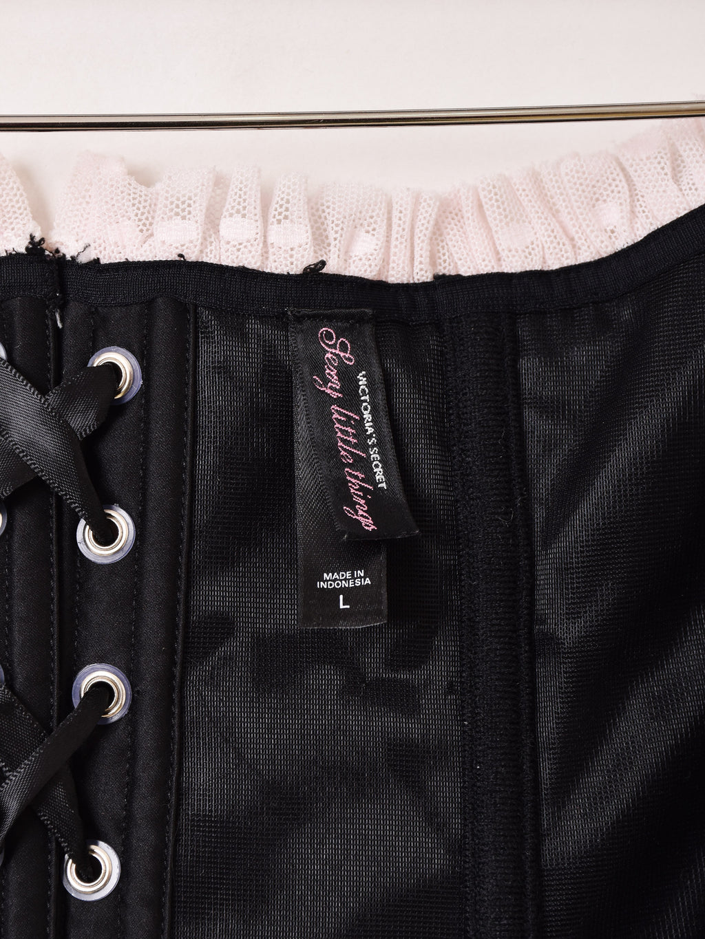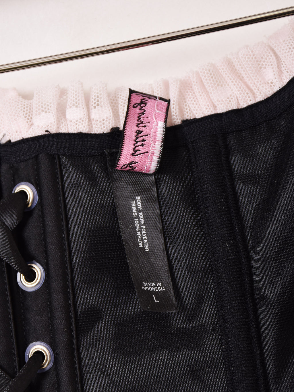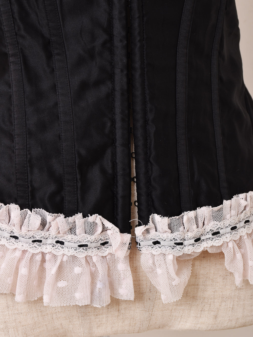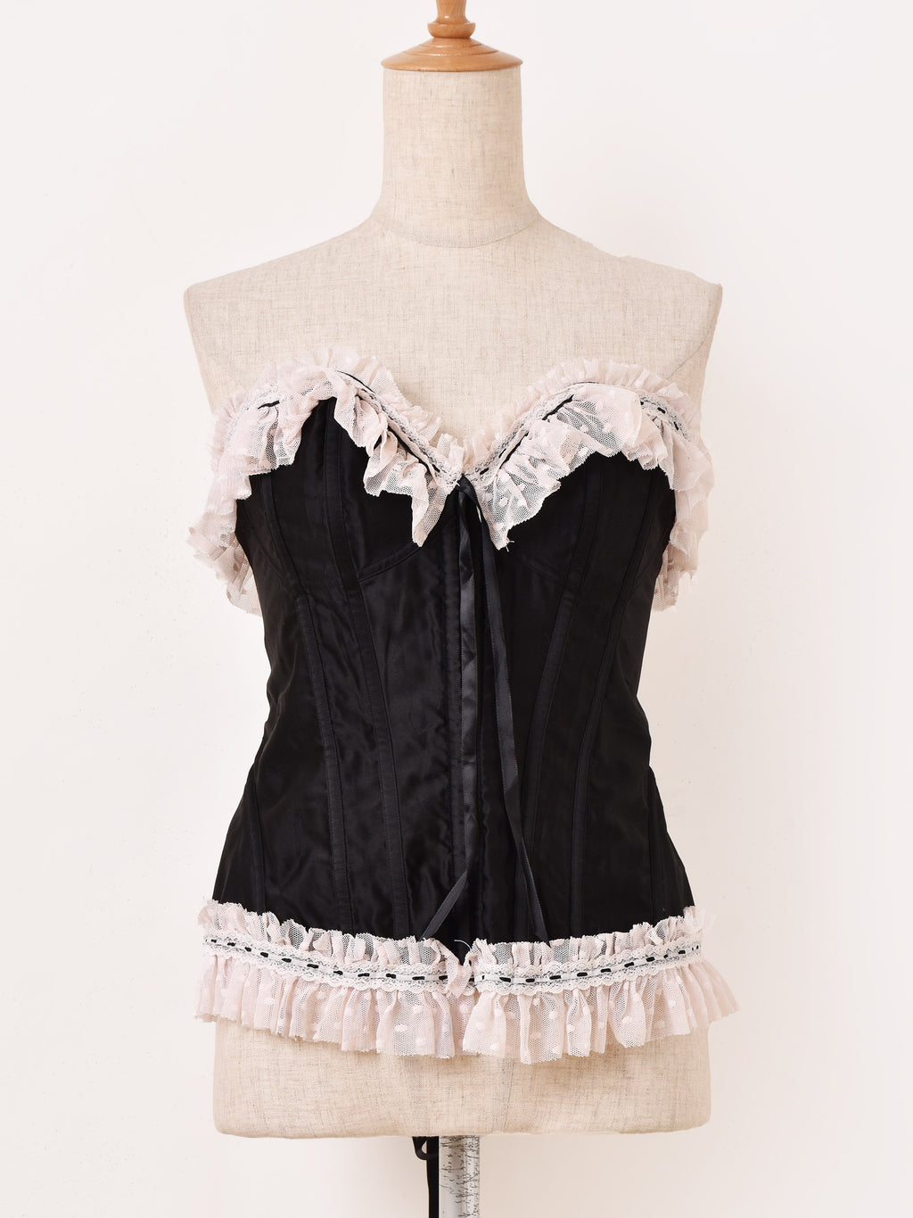 フロントホック仕様でバックがレースアップになったコルセット。ガーリーなピンクのフリルレースも可愛い一着。インナーやトップスの上から重ね着でき、コーディネートのアクセントにおすすめです。