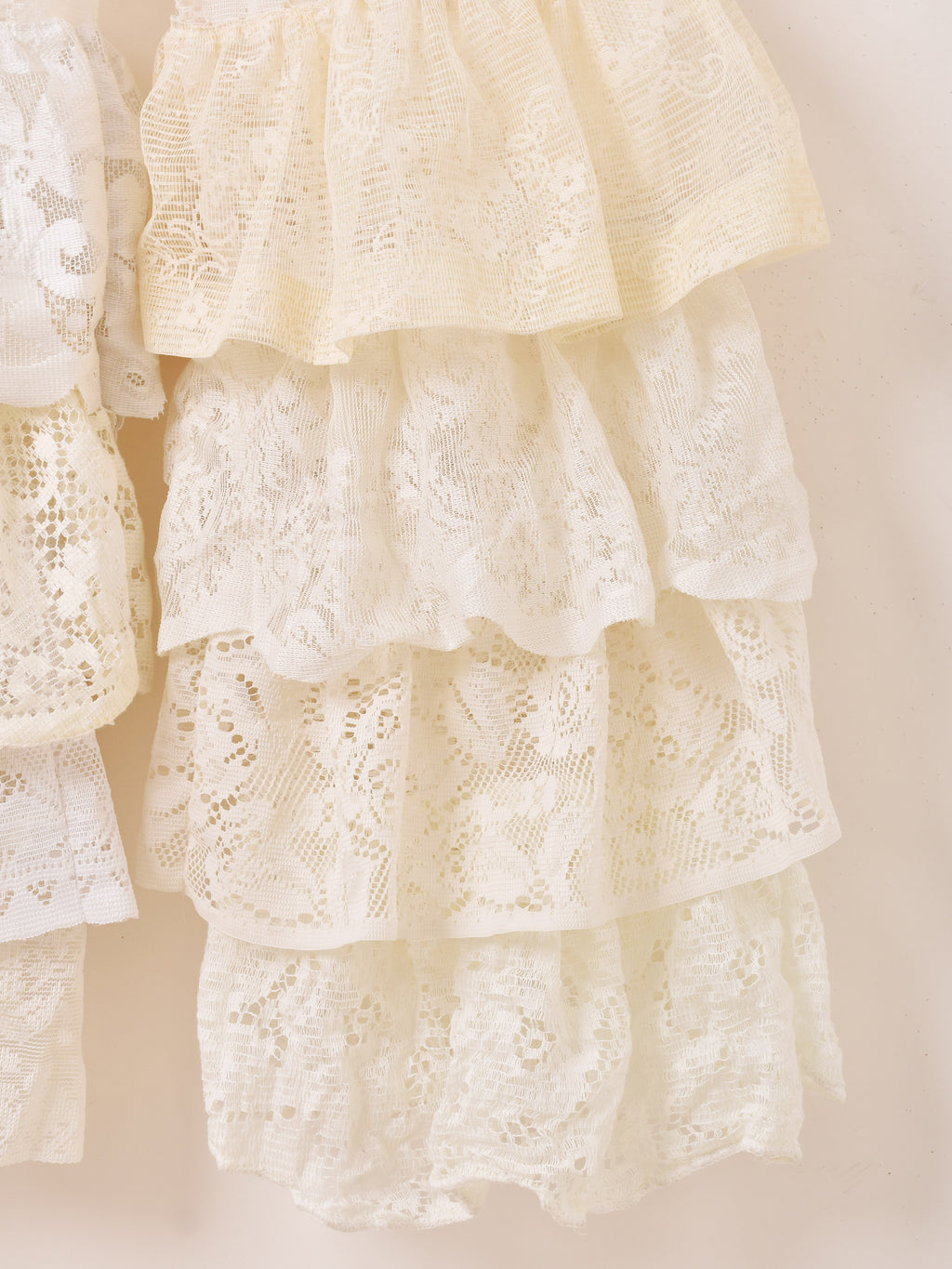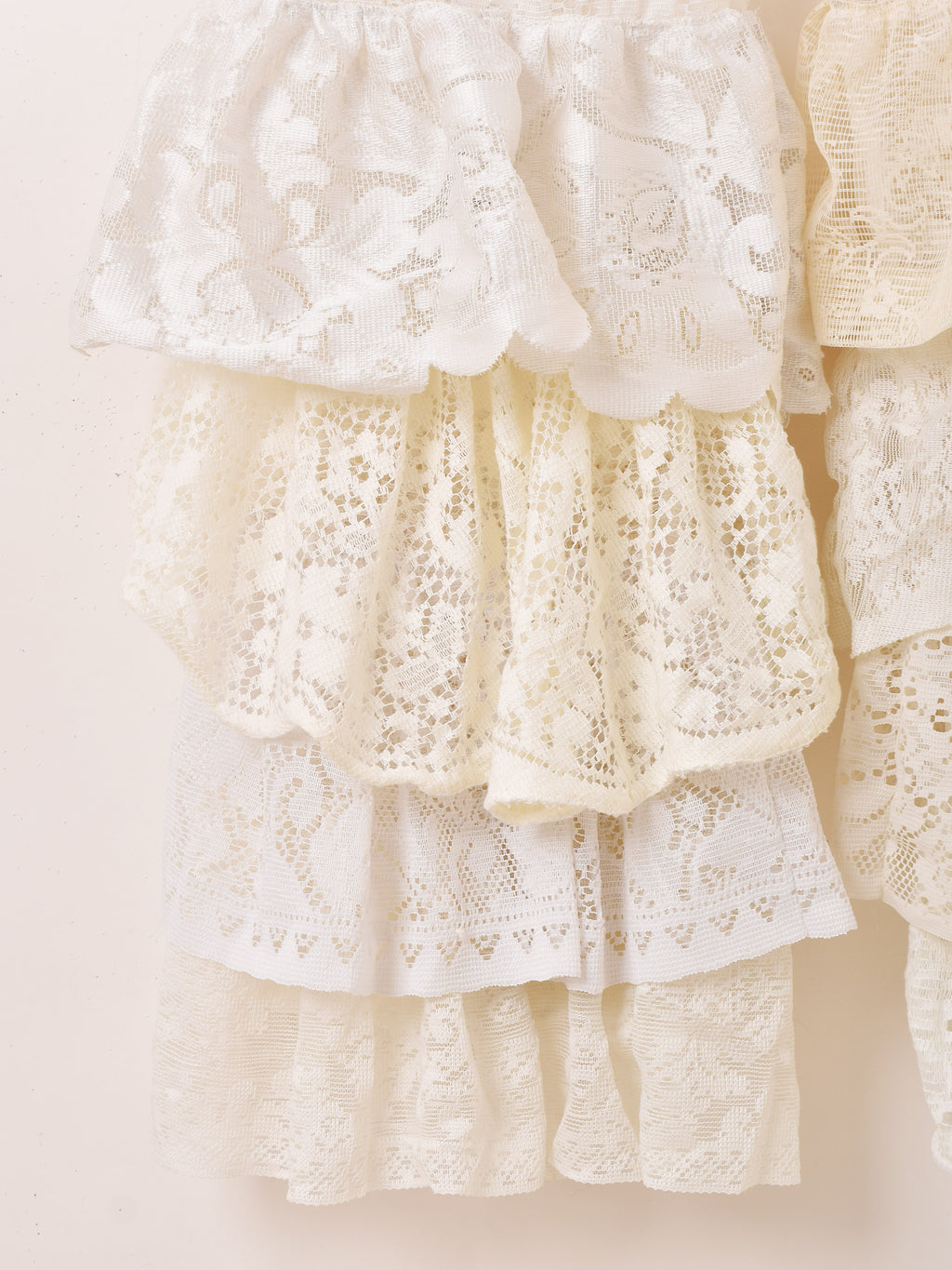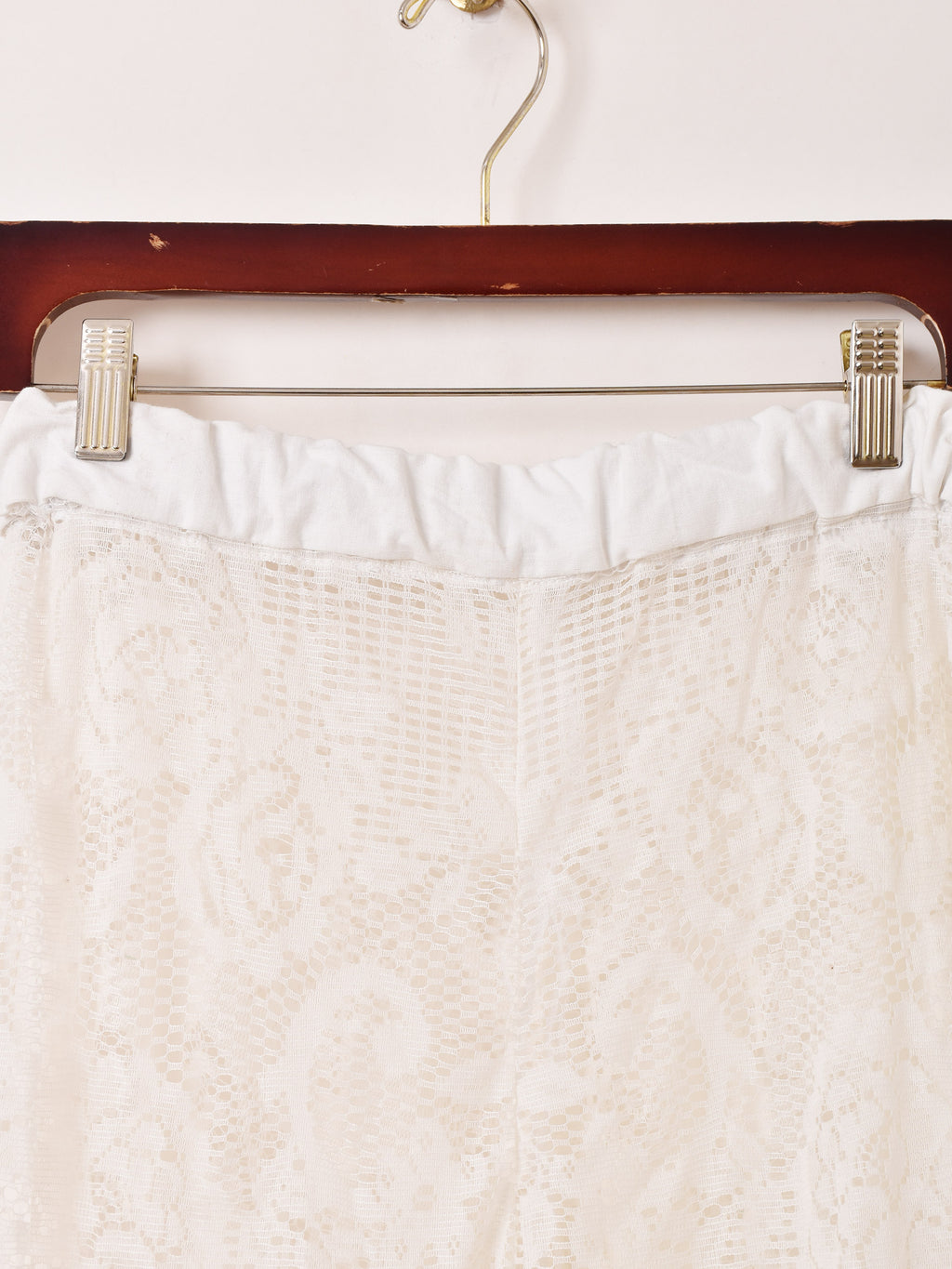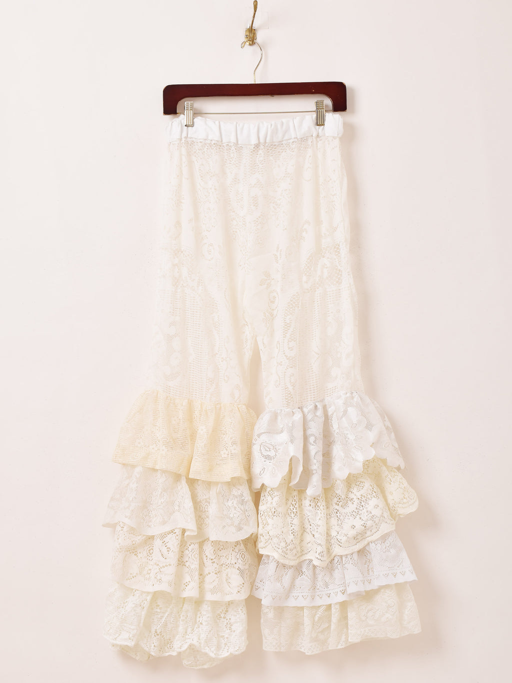 レース生地をリメイクしたフリルパンツ。レースの透け感とフリルのボリューム感がたまらない、存在感のある一着です。他のパンツアイテムと組み合わせたり、スカートやワンピースの下にレイヤードしたりと、おしゃれに着回せる万能アイテムです。